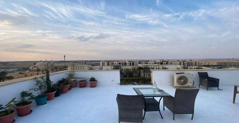 Cozy 1 bedroom in Sheikh Zayed city in the suburbs of Cairo with a fantastic view of the sunset, and a large rooftop terrace to enjoy it from